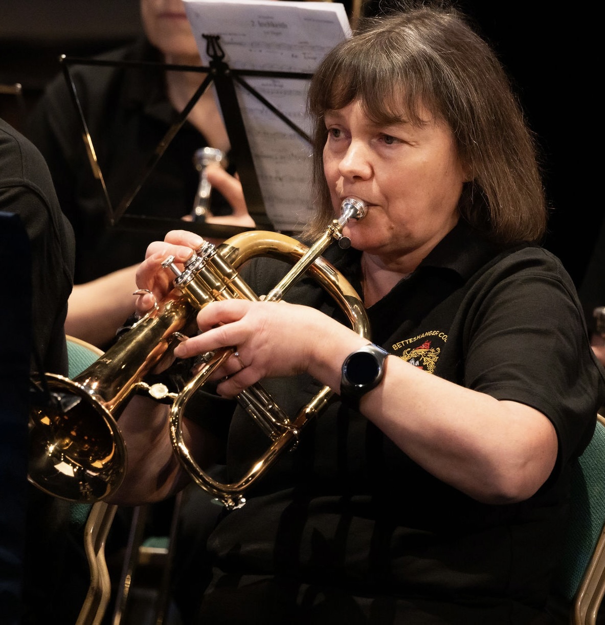 Karen grew up being involved with the Shirley Silver Brass band, where her Grandfather, Father, Uncle and brother were all playing members. It was therefore inevitable when a brass teacher gave Karen a cornet at junior school, she was able to play a note.